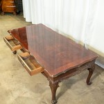 Антикварный придиванный столик авторства нидерландских мастеров выполнен из махагони великолепного каштанового оттенка. По стилистической принадлежности столик тяготеет к эстетике неорококо, что проявилось в мягких округлых формах, легкости пропорций и игривом атектонизме деталей. Столик из коллекции Alter Ego Home оснащен столешницей фигурного контура, вместительными выдвижными ящиками в подстолье и невысокими ножками-кабриоль с широкой лобовой частью, декорированной резным акантовым листом. Выдвижные ящики дополнены металлическими фигурными ручками, придающими дополнительное декоративное звучание предмету. Столик датирован 1950-ми гг.