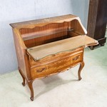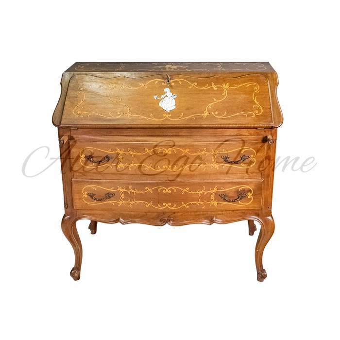 Винтажный стол-секретер выполнен в Италии из ореха медового оттенка. По стилистической принадлежности секретер тяготеет к эстетике неорококо, о чем свидетельствуют форма и декоративное решение предмета. Секретер - мебельная форма, появившаяся в Европе в эпоху Ренессанса. Исторически секретер считался прерогативой аристократов, символом высокого общественного положения. Он предназначался для хранения бумаг, а откидная крышка позволяла бегло ответить на корреспонденцию. Секретер имеет откидную доску - столешницу, оформленную стеклом. Внутренний объем разделен стеклянной полкой для хранения бумаг и письменных принадлежностей. В нижней части секретер дополнен двумя глухими выдвижными ящиками с фигурными металлическими ручками. Неповторимый художественный облик секретеру придает искусно выполненная интарсия в виде растительных мотивов из светлой породы дерева. Центральная панель украшена интарсией из кости в виде барышни с с корзиной цветов в руках. Секретер имеет ножки-кабриоль, заканчивающиеся валютообразными завитками. Секретер датируется 1950-ми гг.