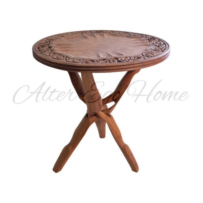 В нашем салоне антикварной мебели вы можете купить винтажный кофейный столик авторства индонезийских мастеров, выполненный из тикового массива богатого медного оттенка с великолепной природной текстурой. Тропические леса Индонезии являются богатым источником материалов для мебельной промышленности и обеспечивают ее древесиной тика и красного дерева - основных пород древесины, используемых для изготовления высококачественной мебели. Столик отличается аутентичностью и оригинальностью конструктивного решения, подчеркивающего красоту тикового массива. Столик трактован круглой профилированной столешницей, декорированной роскошной резьбой цветочного характера. Рельефная поверхность столешницы придает столешнице динамику и неповторимость. Три скрещивающихся ножки художественно обработаны резцом, что придает предмету особую живость. Столик датирован 1940-ми гг.