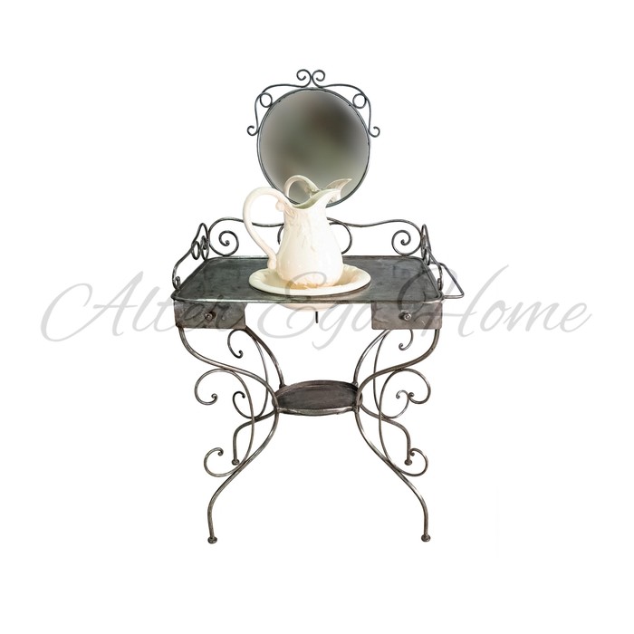 В нашем салоне антикварной мебели вы можете купить винтажный туалетный столик, выполненный нидерландскими мастерами из кованного металла. Туалетные столики появились в Европе в XVIII столетии и не предназначались для посторонних глаз. На протяжении столетий туалетные столики претерпевали множество конструктивных и стилистических изменений, однако всегда оставались желанным предметом интерьера, требующим соответствующего места в доме. Столик из коллекции Alter Ego Home отличается предельной аутентичностью и неповторимостью. Он трактован прямоугольной столешницей с двумя выдвижными ящичками, обрамленной фигурными узорчатыми устоями. Х-образные ножки, соединенные проножной перекладиной, продолжают стилистическую линию столешницы. Столик дополнен овальным зеркалом. В комплекте к туалетному столику прилагается керамический кувшин с чашей. Туалетный столик датирован 1950-ми гг.
