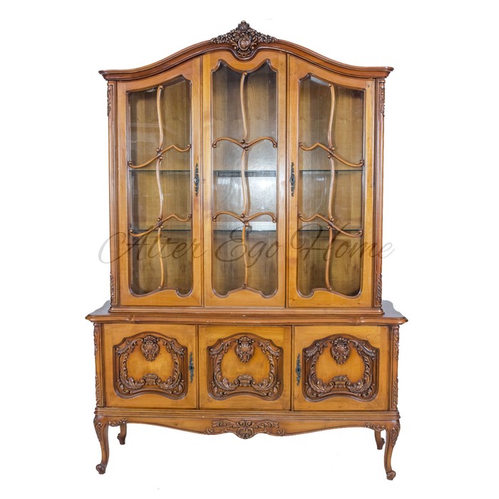 В нашем салоне старинной мебели вы можете купить винтажный буфет авторства бельгийских мастеров, выполненный из древесины ореха коньячного оттенка. По стилистической принадлежности буфет можно отнести к стилю неорококо, набравшему популярность в Европе в первой половине XIX века. Архитектонике буфета присущи рокайльные формы и пропорции. Буфет имеет распашные застекленные дверцы, застекленные торцы, две массивных глухих дверцы и четыре ножки в виде кабриолей. Буфет венчает выступающий профилированный карниз сложной формы с массивным аттиком с резной композицией. Дополнительными декоративными акцентами служат фигурные металлические накладки-уключины на поверхности буфета. Винтажный буфет датирован серединой XX века.