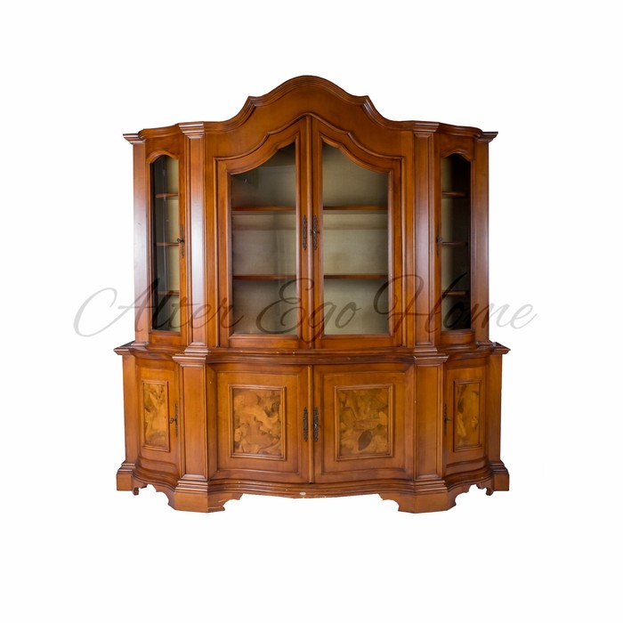 Верхняя часть украшена резным сводчатым карнизом с волнистыми линиями и четырьмя изящными застекленными дверцами. Нижнюю часть украшают изогнутые глухие дверцы со вставками из капа ореха, имитирующими технику маркетри. Ножки в виде резных фигурных планок органично дополняют общий рисунок.