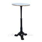 Круглая столешница выполнена из белого мрамора, на котором прослеживаются естественные природные узоры. Затейливая металлическая ножка сделана в виде каннелированной колонны, расходящейся на резную "треногу" с растительными орнаментами.